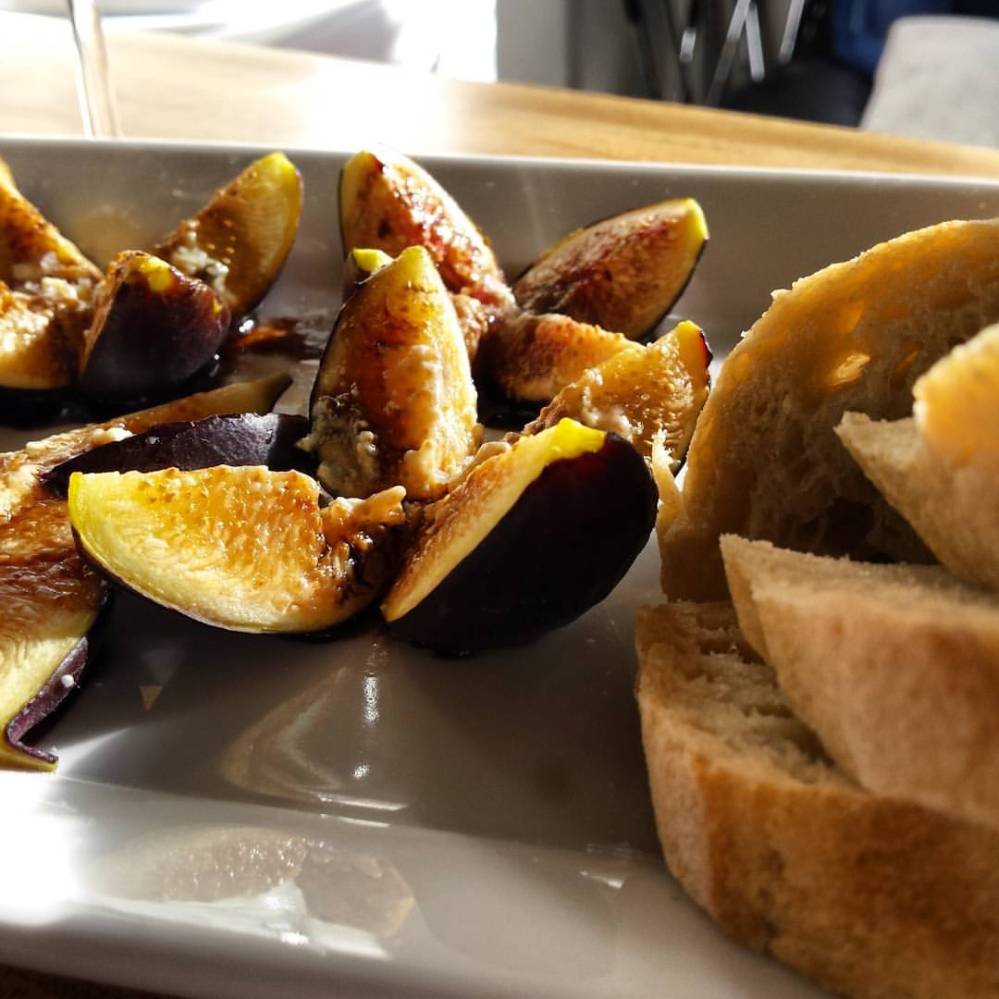 Appetizer: Roasted fig flowers with blue cheese, a drizzle of pomegranate balsamic and local sea salt. Paired with Cloudy Bay Sauvignon Blanc.
